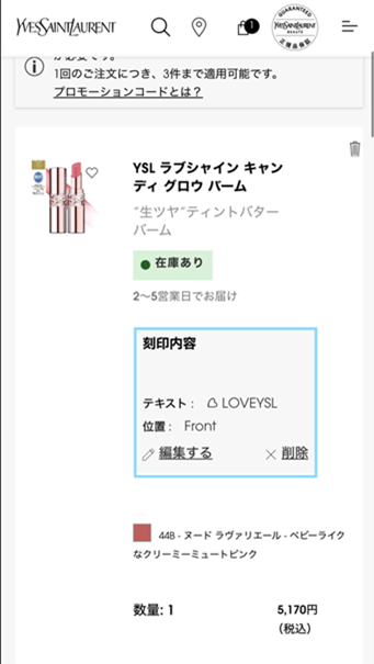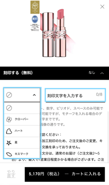 ご購入手続きへのボタンを押した後に遷移する、注文内容確認画面で、該当製品に、刻印内容が記載されています(下記青枠内)。ここに刻印の記載がない場合、刻印を承っておりません。