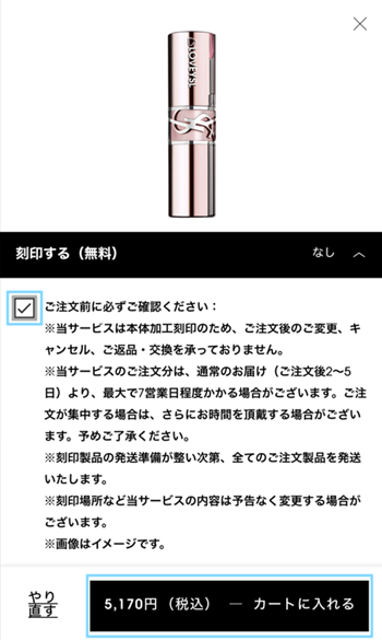 Step5)刻印受付時のご注意事項をご一読いただき、チェックボタンを入れ、「カートに入れる」を押す。